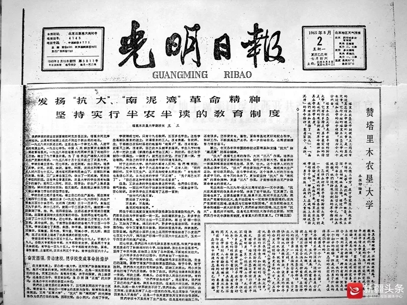 1965年8月2日,《光明日報》發(fā)表文章:《發(fā)揚“抗大”、“南泥灣”革命精神 堅持實行半農(nóng)半讀的教育制度》