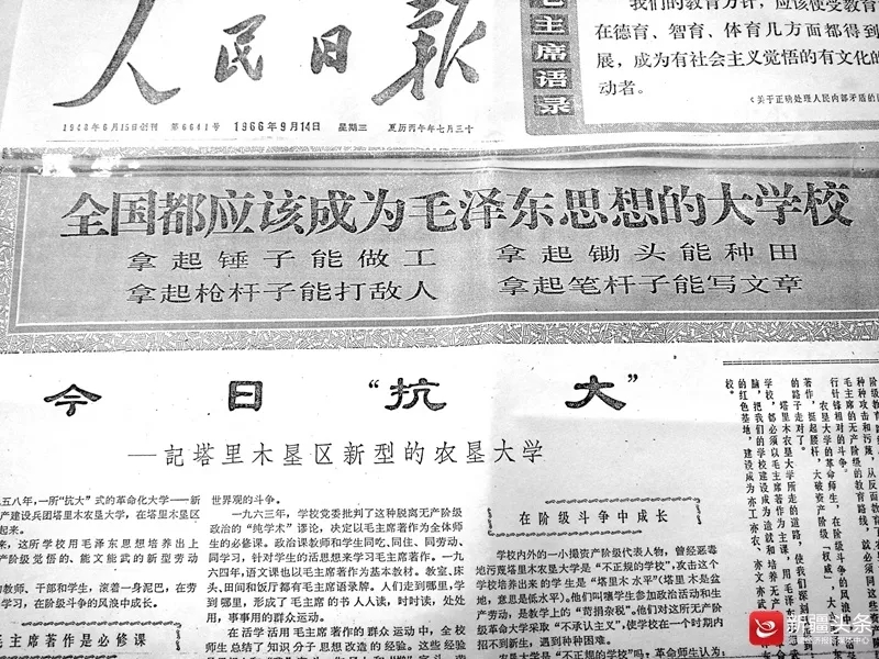 1966年9月14日,《人民日報》發(fā)表文章《今日“抗大”——記塔里木墾區(qū)新型的農(nóng)墾大學》,對學校在創(chuàng)辦過程中,堅持艱苦創(chuàng)業(yè)、勤儉辦校、發(fā)揚“抗大”作風和“南泥灣”精神取得的成果給予了高度評價。