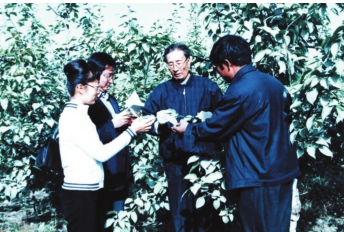 2003年12月9日,塔大園林系教授閆春雨(右二)在果園進行現場教學(資料片)。
