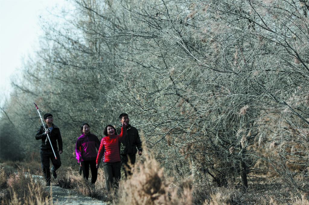 12月14日,塔里木大學生命科學學院教授李志軍(右二)在學校附近的實驗林里,帶學生查看胡楊的生長情況。有人說,塔大師生的身上總有一股泥土味、羊糞味、牛糞味,這恰恰是群眾對他們最高的褒獎。