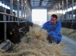 12月15日,在阿拉爾市大漠黑牛養殖示范基地,塔里木大學動物科學學院2011年畢業生楊順邦在查看牛飼料的品質。